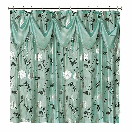 This Popular Bath Avanti shower curtain epitomizes elegance. With its leafy vines and floral graphics, your entire bathroom is sure to blossom with beauty. Plus, the attached valance completes the look. In aqua.