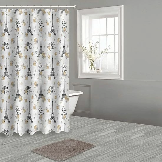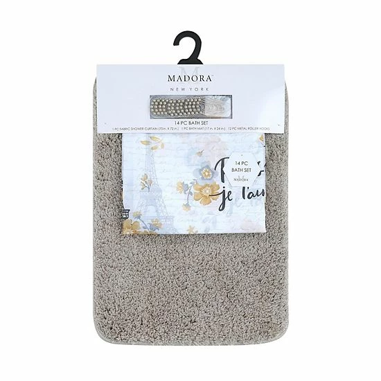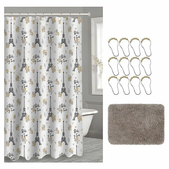 - 14-piece set includes: shower curtain, bath rug & 12 shower curtain hooks