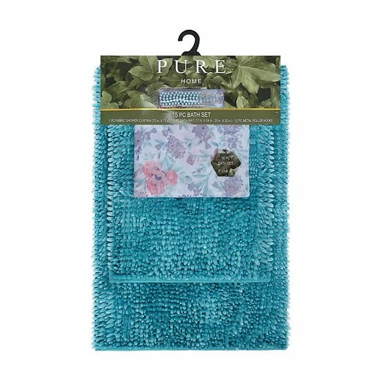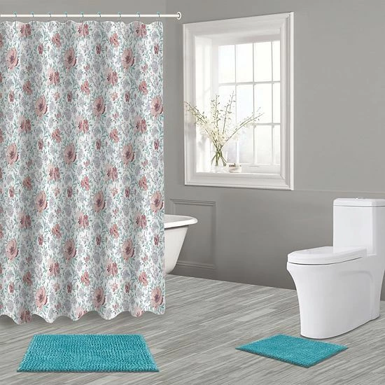 - 15-piece set includes: shower curtain, 2 bath rugs & 12 shower curtain hooks